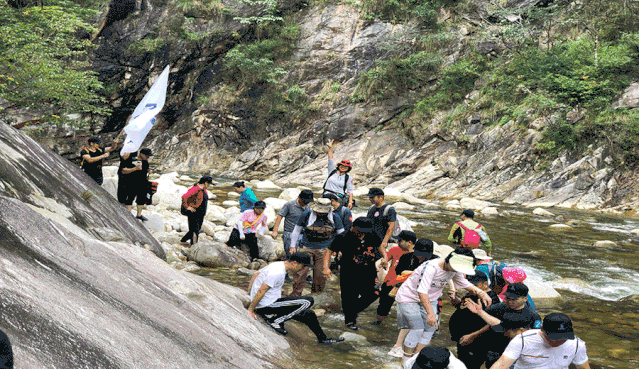 山河遠(yuǎn)闊,自然值得一探究竟。根據(jù)村民們的指引,大家最后一站來到了龍井峽。峽谷內(nèi)瀑布成群,怪石遍地,對(duì)我們來說又是一次巨大的挑戰(zhàn)。從入口處下車,步入林蔭山道,山邊小路苔蘚密布,大家小心翼翼地一步步前行。近三十分鐘的路程后,來到了龍井河下游的第一個(gè)瀑布龍井瀑,人尚未走近,奔騰的水霧撲面而來,約五十米高如柱的水流從天而降,直泄瀑底的龍井潭。大家被自然的景觀深深折服。