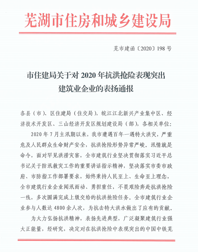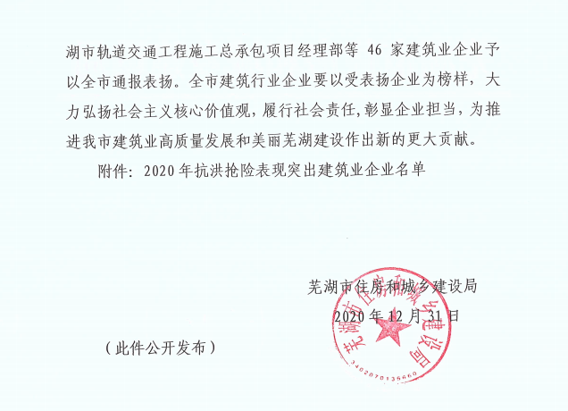 近日,蕪湖市住房和城鄉(xiāng)建設(shè)局對(duì)2020年度抗洪搶險(xiǎn)表現(xiàn)突出企業(yè)進(jìn)行了表彰。