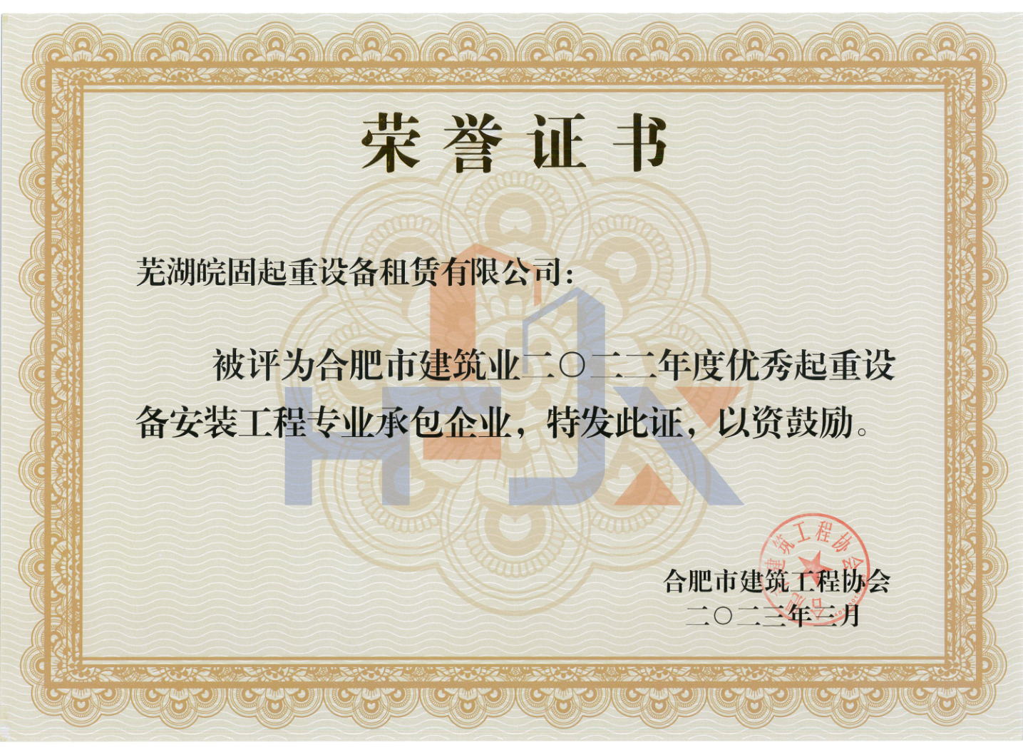 蕪湖皖固被評(píng)為“合肥建筑業(yè)2022年度合肥建筑業(yè)優(yōu)秀起重設(shè)備安裝工程專業(yè)承包企業(yè)”