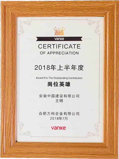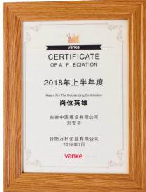 愛崗敬業(yè)結碩果!中固人劉官平、王明兩位員工,榮獲合肥萬科企業(yè)有限公司2018年上半年度“崗位英雄獎”。