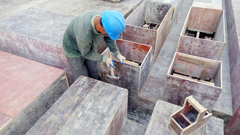 6點(diǎn)10分,筆者和張師傅走進(jìn)工地的人貨電梯,來(lái)到28層他工作的地方,木工工具錘“叮咚”的聲音四處飄散開來(lái),仿若一首動(dòng)聽的打擊樂(lè)。