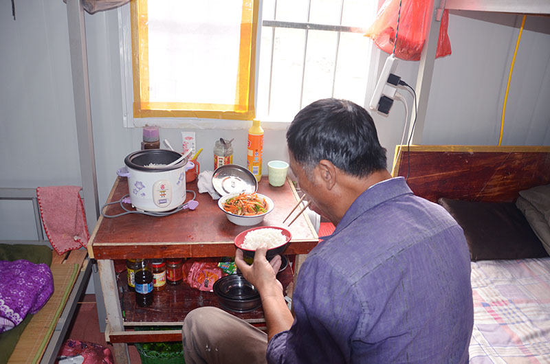 中午12點(diǎn),張師傅下班做好飯,開始享受午餐。張師傅告訴筆者:“每天都是前一天晚上買好菜第二天下班后做飯,自己做著吃干凈、營(yíng)養(yǎng)”。雖然只有一個(gè)菜,但是他卻十分享受。