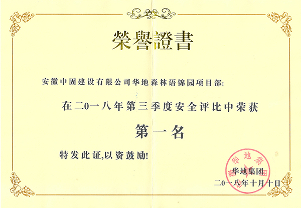 近日,安徽中固建設(shè)有限公司?華地森林語錦園項(xiàng)目以總分96.4分的高分,榮獲華地集團(tuán)2018年三季度“安全競賽評比活動”第一名。