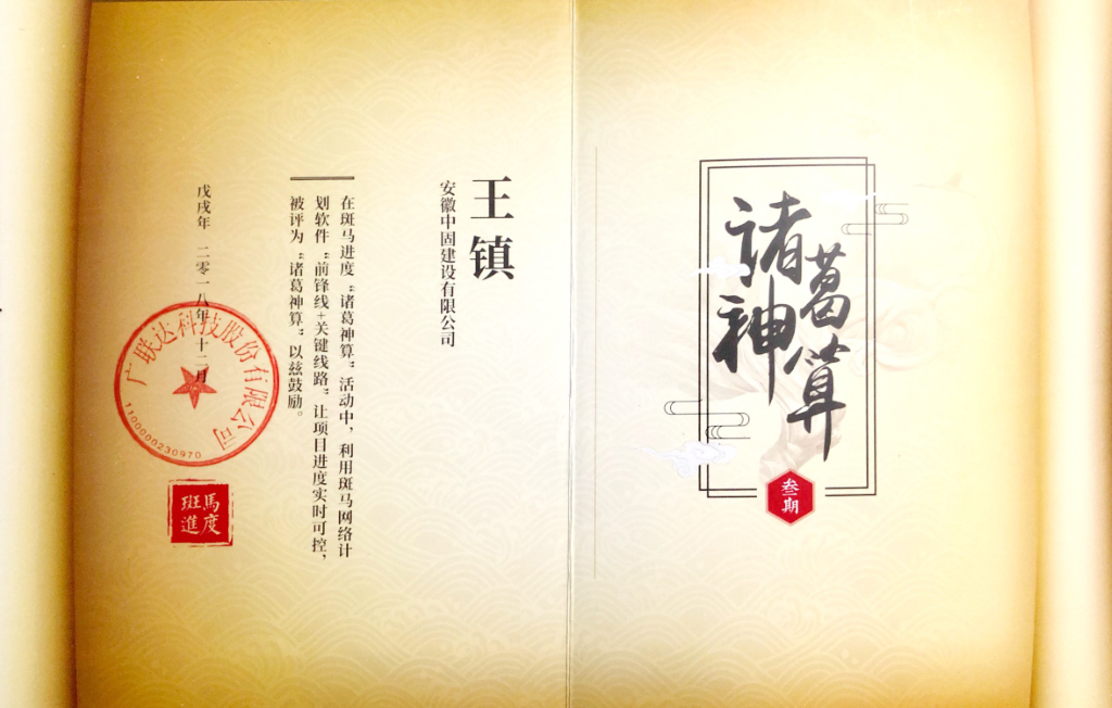 2019年1月11日,他代表公司參加廣聯(lián)達(dá)科技股份有限公司舉辦的“諸葛神算”活動,使用了“前鋒線+關(guān)鍵線路”這一應(yīng)用,為項目進(jìn)度糾偏提供技術(shù)支持,榮獲了“進(jìn)度管控優(yōu)秀項目”獎。